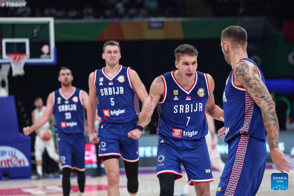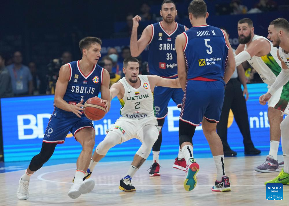Serbia's Bogdan Bogdanovic (1st L) competes during the quarterfinal between Lithuania and Serbia at the 2023 FIBA World Cup in Manila, the Philippines, Sept. 5, 2023. (Xinhua/Meng Yongmin)