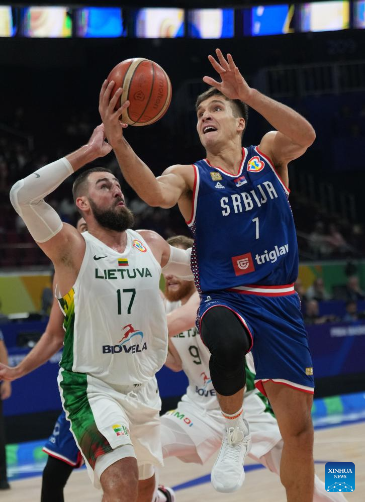 Bogdan Bogdanovic (R) of Serbia goes for a basket during the quarterfinal between Lithuania and Serbia at the 2023 FIBA World Cup in Manila, the Philippines, Sept. 5, 2023. (Xinhua/Meng Yongmin)
