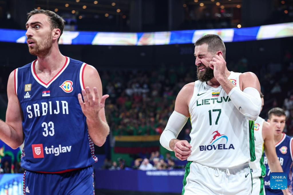 Jonas Valanciunas (R) of Lithuania reacts during the quarterfinal between Lithuania and Serbia at the 2023 FIBA World Cup in Manila, the Philippines, Sept. 5, 2023. (Xinhua/Wu Zhuang)