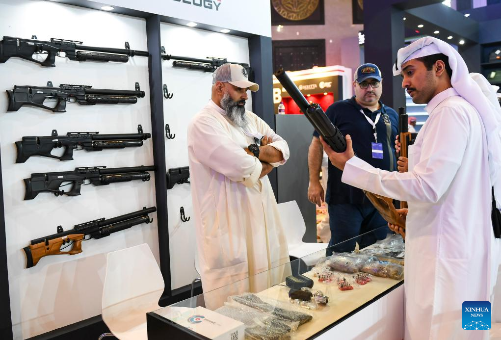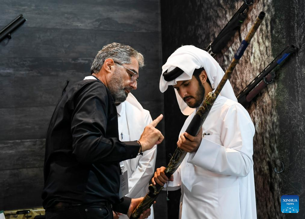 People look at a hunting rifle in the guns section of the seventh edition of Katara International Hunting and Falcons Exhibition 2023 at Katara Cultural Village in Doha, Qatar, Sept. 5, 2023. The event is held here from Sept. 5 to 9 with the participation of more than 190 international exhibitors. (Photo by Nikku/Xinhua)