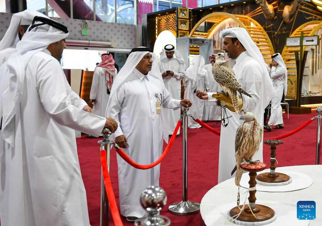 An exhibitor shows a falcon during the seventh edition of Katara International Hunting and Falcons Exhibition 2023 at Katara Cultural Village in Doha, Qatar, Sept. 5, 2023. The event is held here from Sept. 5 to 9 with the participation of more than 190 international exhibitors. (Photo by Nikku/Xinhua)