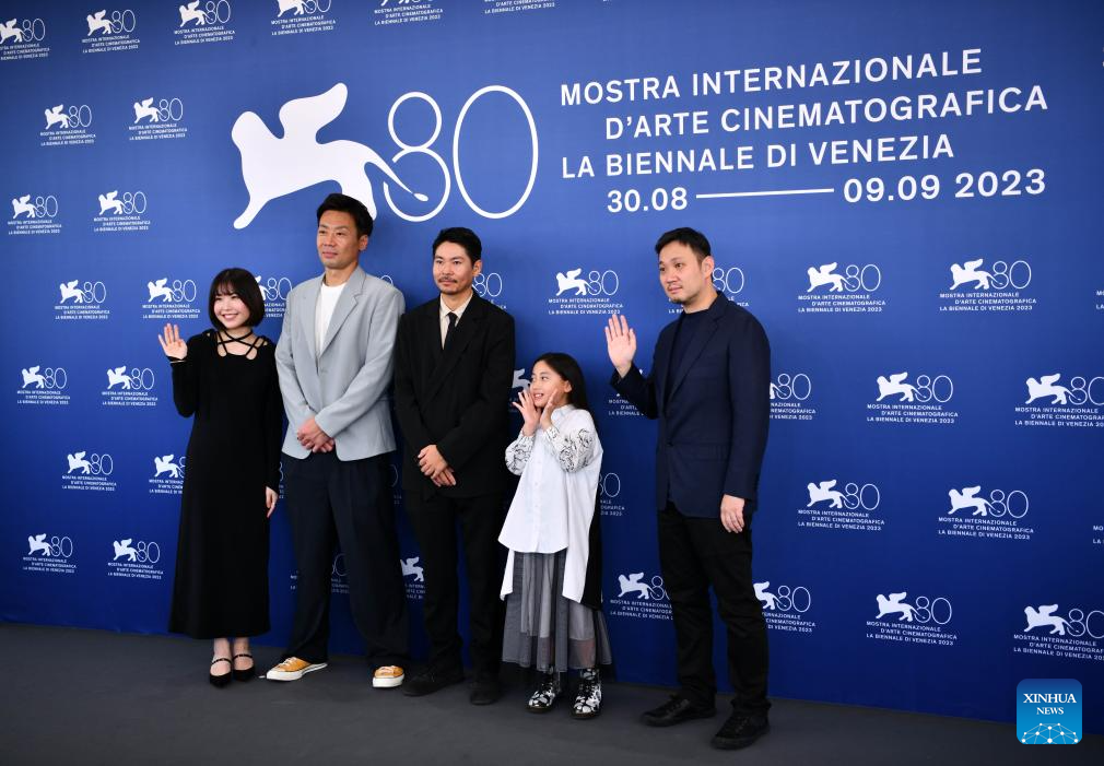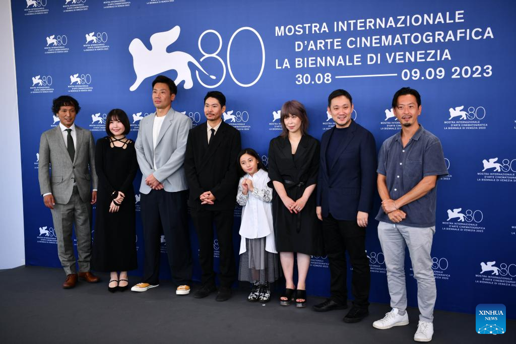 Director Ryusuke Hamaguchi (2nd R) and his crew members attend a photocall for the film "Evil Does Not Exist" during the 80th Venice International Film Festival in Venice, Italy, on Sept. 4, 2023. (Xinhua/Jin Mamengni)