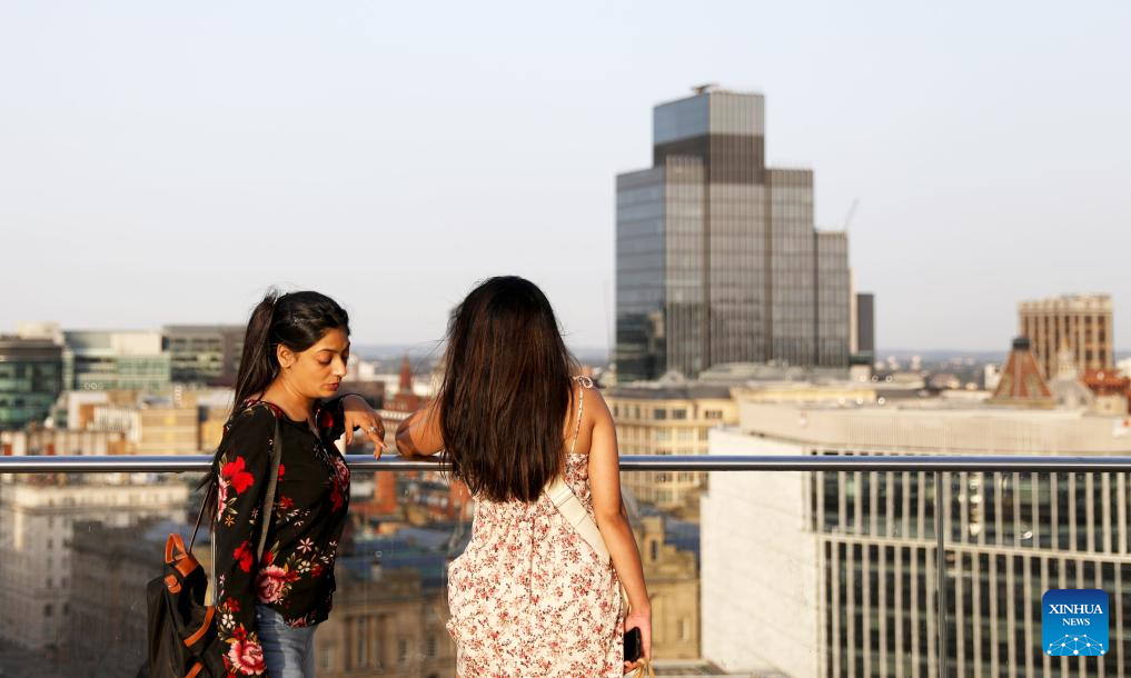 A woman watches the skyline of Birmingham, Britain, Sept. 5, 2023. The City Council of Birmingham in the United Kingdom (UK) declared itself effectively bankrupt on Tuesday. The Council announced it was unable to meet its debts, which it has accrued mainly due to equal pay claims by staff and former staff. (Xinhua/Li Ying)