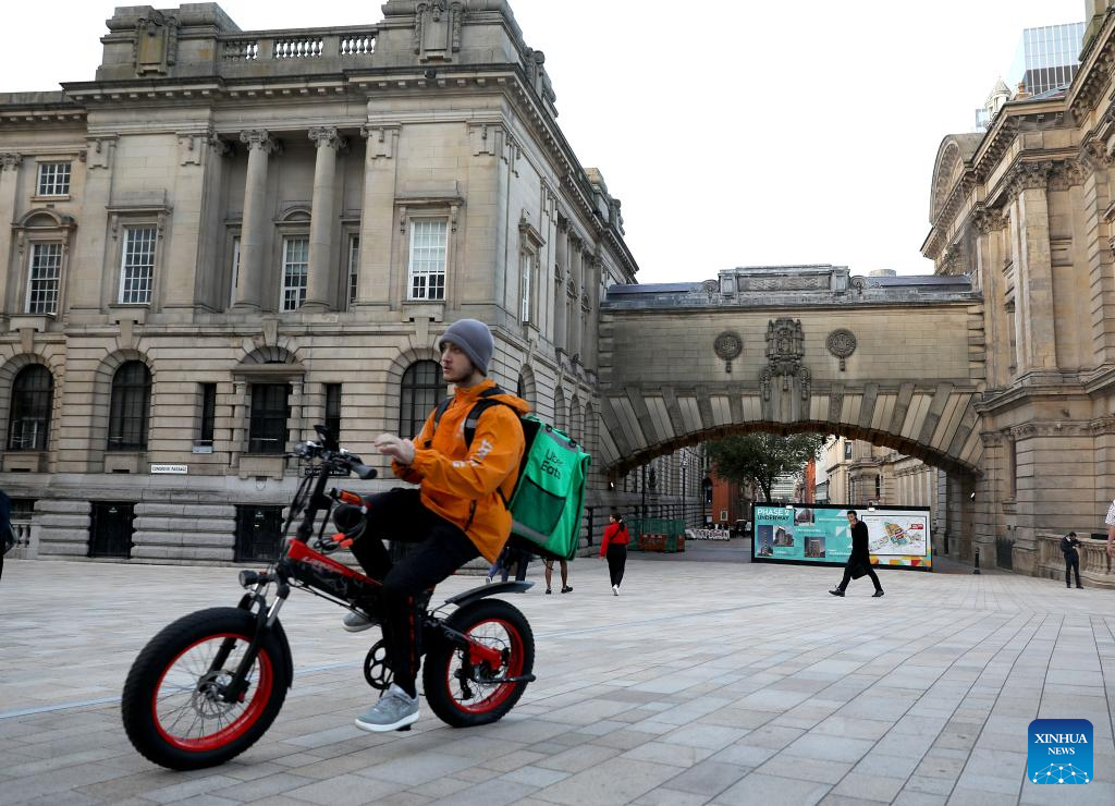 A deliveryman rides in Central Birmingham, Britain, Sept. 5, 2023. The City Council of Birmingham in the United Kingdom (UK) declared itself effectively bankrupt on Tuesday. The Council announced it was unable to meet its debts, which it has accrued mainly due to equal pay claims by staff and former staff. (Xinhua/Li Ying)(Xinhua/Li Ying)