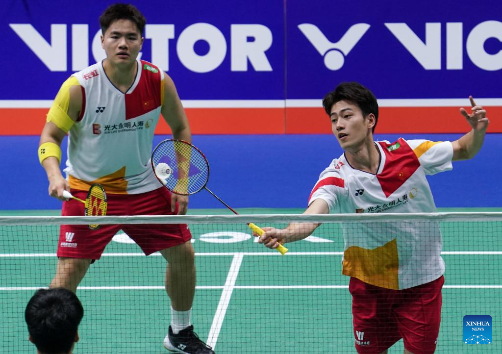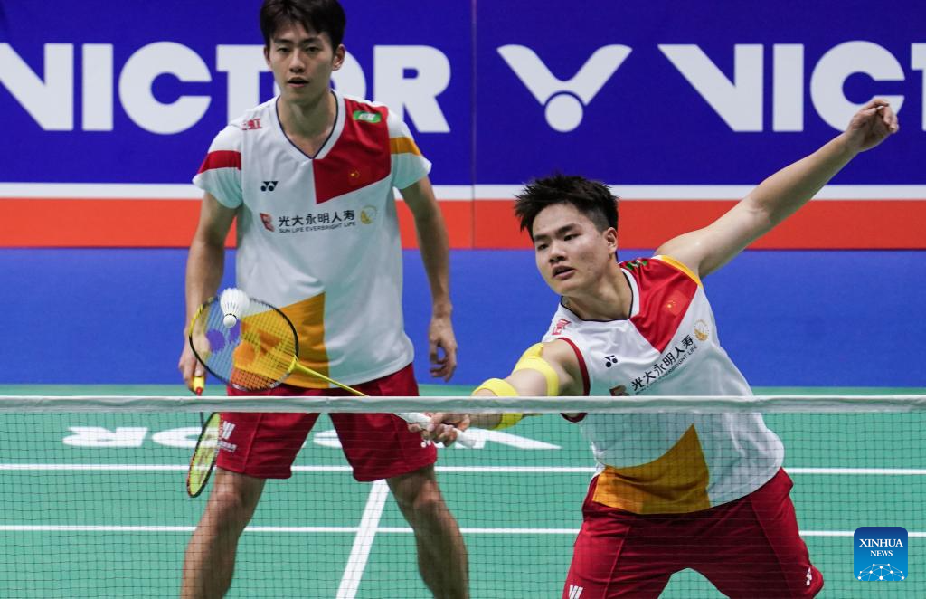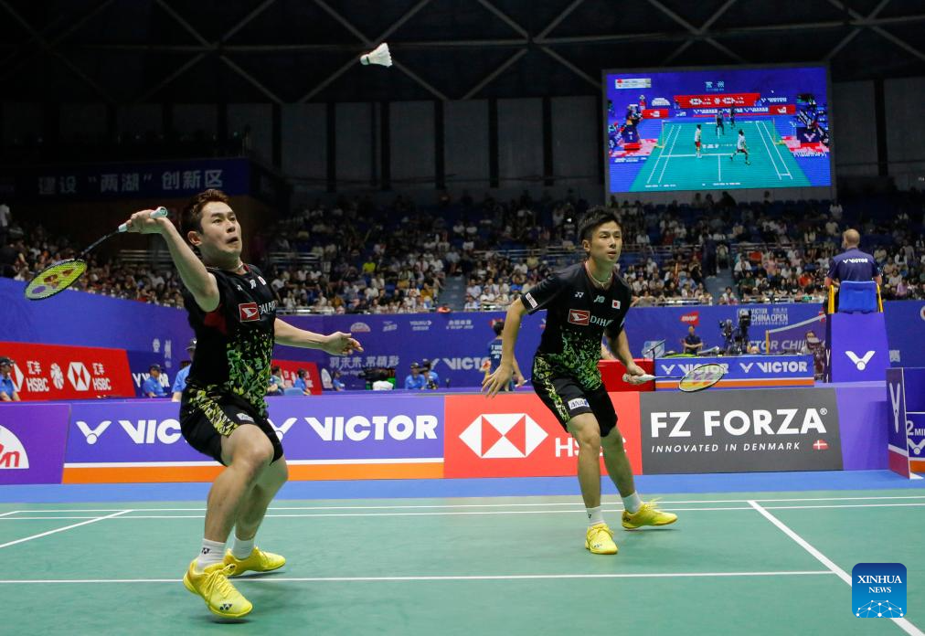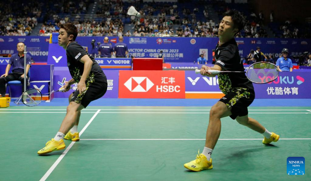 Liang Weikeng/Wang Chang (R) compete during the men's doubles second round match between Liang Weikeng/Wang Chang of China and Koga Akira/Saito Taichi of Japan at the 2023 China Open badminton tournament in Changzhou, east China's Jiangsu Province, Sept. 7, 2023. (Xinhua/Yang Lei)