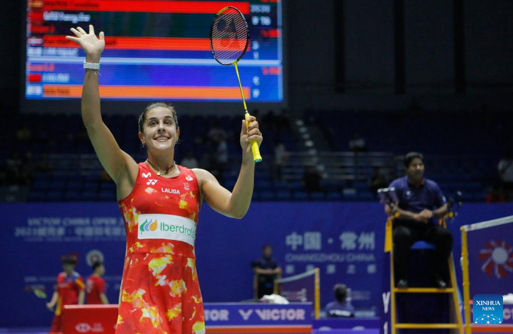 Caroline Marin of Spain greets spectators after the women's singles second round match against Gao Fangjie of China at the 2023 China Open badminton tournament in Changzhou, east China's Jiangsu Province, Sept. 7, 2023. (Xinhua/Liu Wenhui)