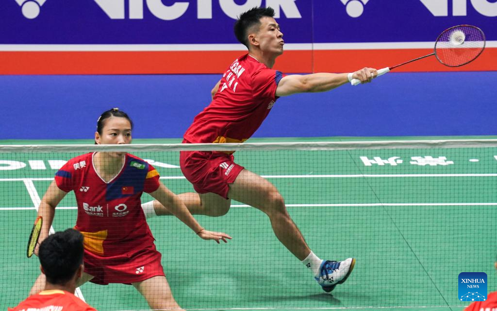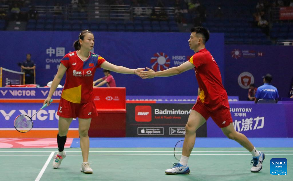 Feng Yanzhe (L)/Huang Dongping of China compete during the mixed doubles second round match between Feng Yanzhe/Huang Dongping of China and Ye Hong Wei/Lee Chia Hsin of Chinese Taipei at the 2023 China Open badminton tournament in Changzhou, east China's Jiangsu Province, Sept. 7, 2023. (Xinhua/Yang Lei)