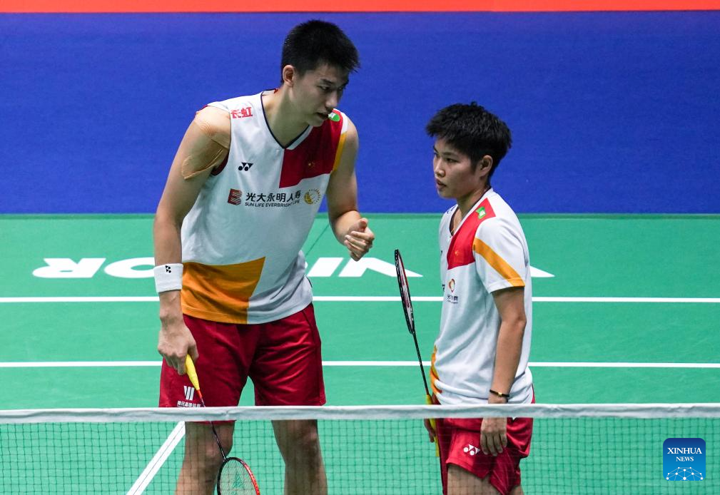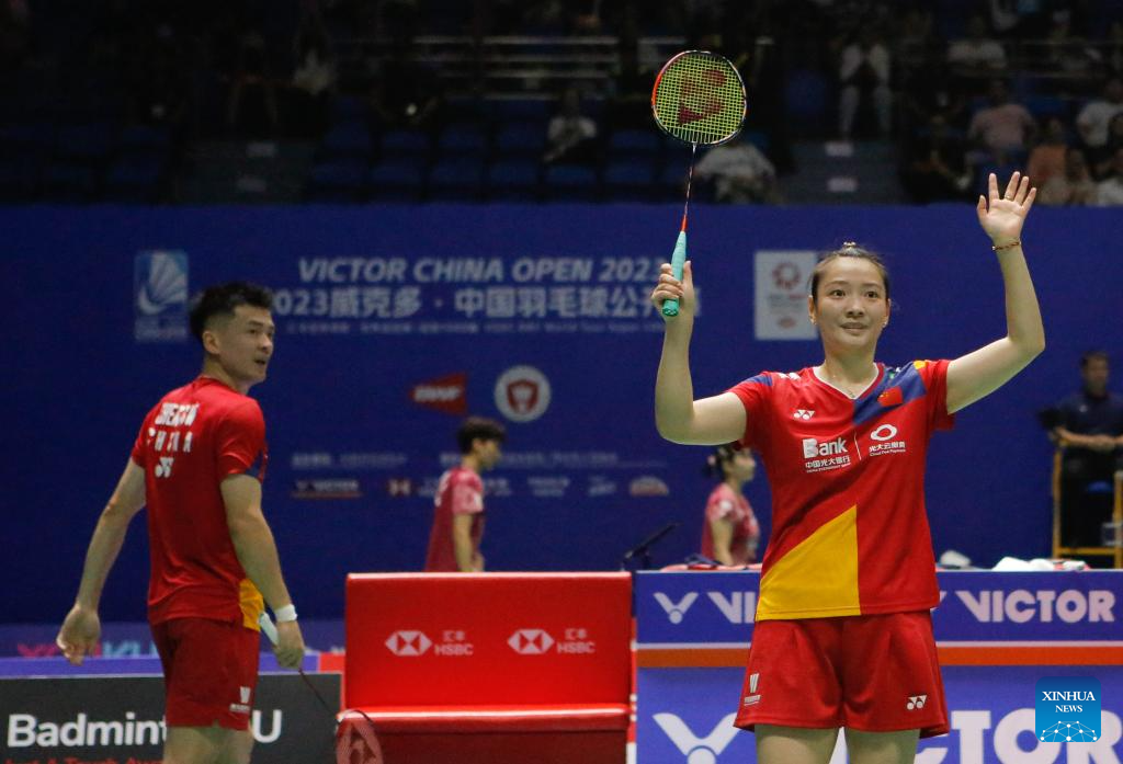 Feng Yanzhe (L)/Huang Dongping of China react during the mixed doubles second round match between Feng Yanzhe/Huang Dongping of China and Ye Hong Wei/Lee Chia Hsin of Chinese Taipei at the 2023 China Open badminton tournament in Changzhou, east China's Jiangsu Province, Sept. 7, 2023. (Xinhua/Yang Lei)
