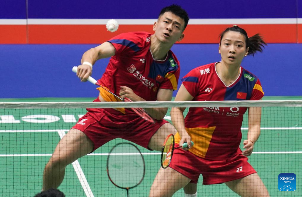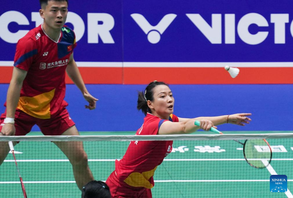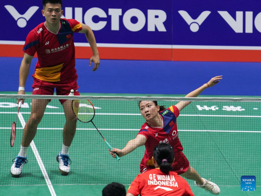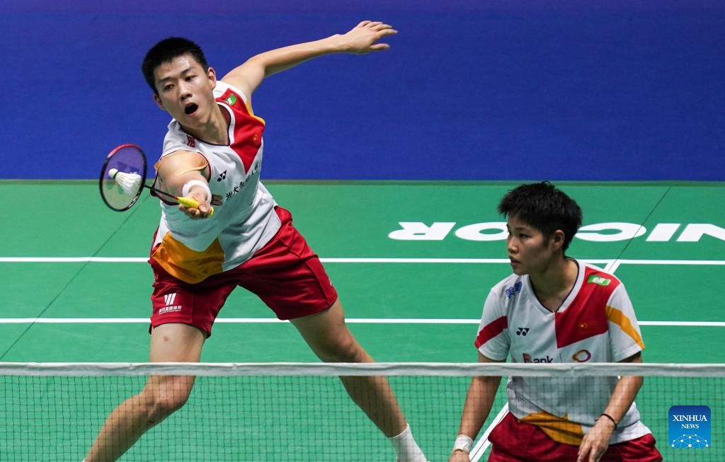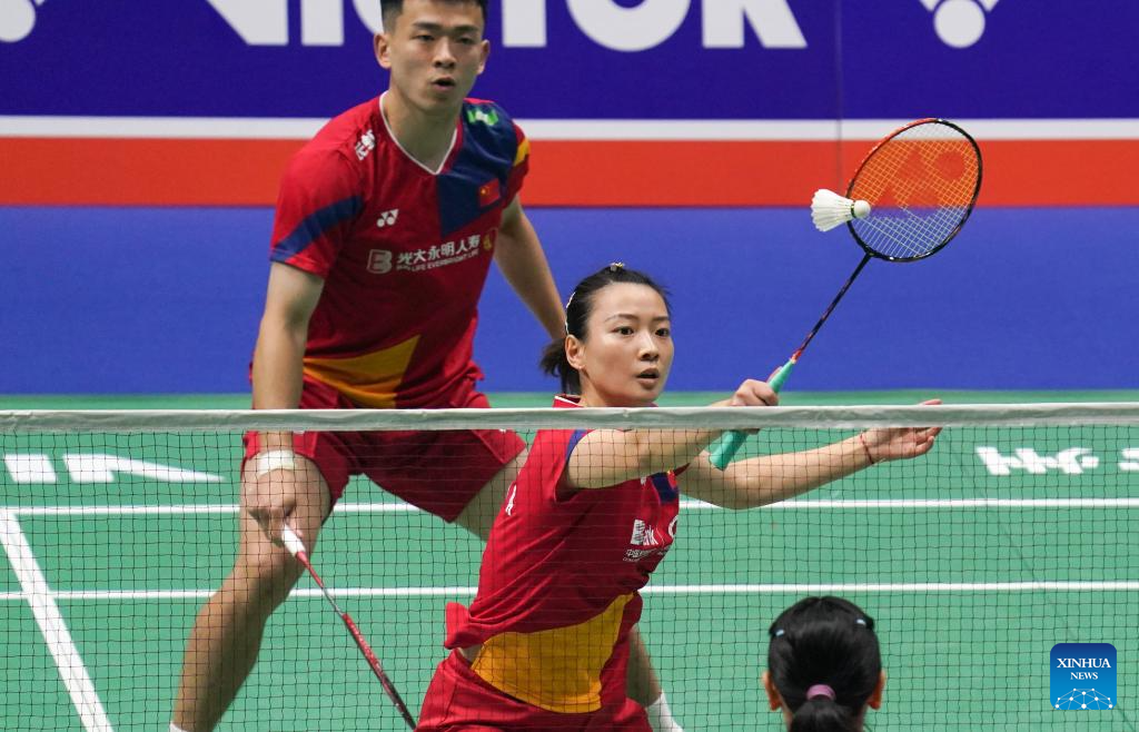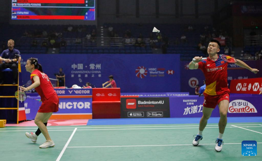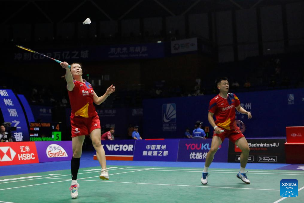 Zheng Siwei/Huang Yaqiong (R) compete during the mixed doubles second round match between Zheng Siwei/Huang Yaqiong of China and Dejan Ferdinansyah/Gloria Emanuelle Widjaja of Indonesia at the 2023 China Open badminton tournament in Changzhou, east China's Jiangsu Province, Sept. 7, 2023. (Xinhua/Yang Lei)