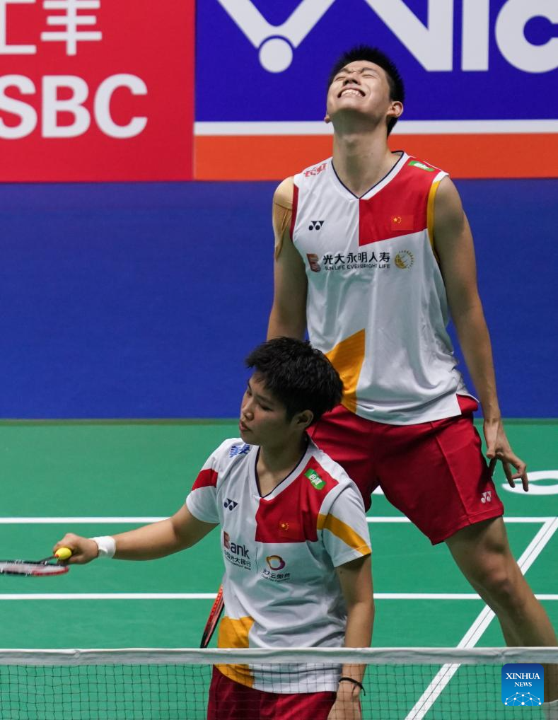 Feng Yanzhe (top)/Huang Dongping of China react during the mixed doubles second round match between Feng Yanzhe/Huang Dongping of China and Ye Hong Wei/Lee Chia Hsin of Chinese Taipei at the 2023 China Open badminton tournament in Changzhou, east China's Jiangsu Province, Sept. 7, 2023. (Xinhua/Yang Lei)