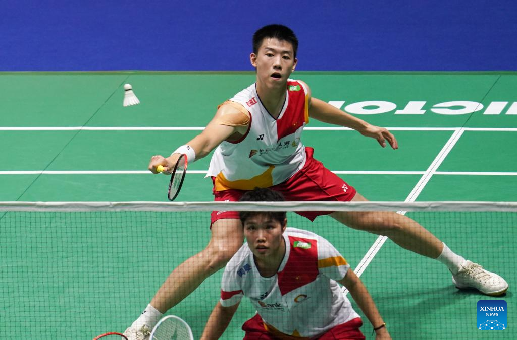 Liang Weikeng/Wang Chang (L) compete during the men's doubles second round match between Liang Weikeng/Wang Chang of China and Koga Akira/Saito Taichi of Japan at the 2023 China Open badminton tournament in Changzhou, east China's Jiangsu Province, Sept. 7, 2023. (Xinhua/Yang Lei)