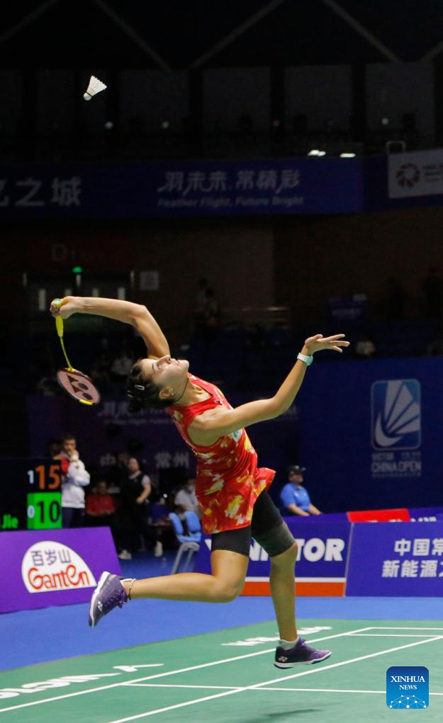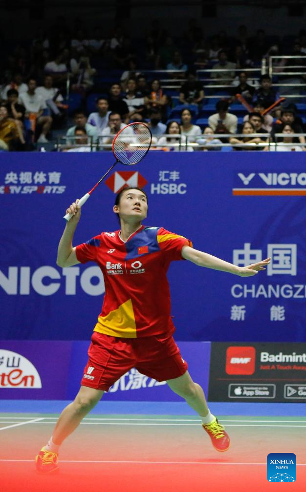 Han Yue of China hits a return during the women's singles second round match against Nguyen Thuy Linh of Vietnam at the 2023 China Open badminton tournament in Changzhou, east China's Jiangsu Province, Sept. 7, 2023. (Xinhua/Liu Wenhui)