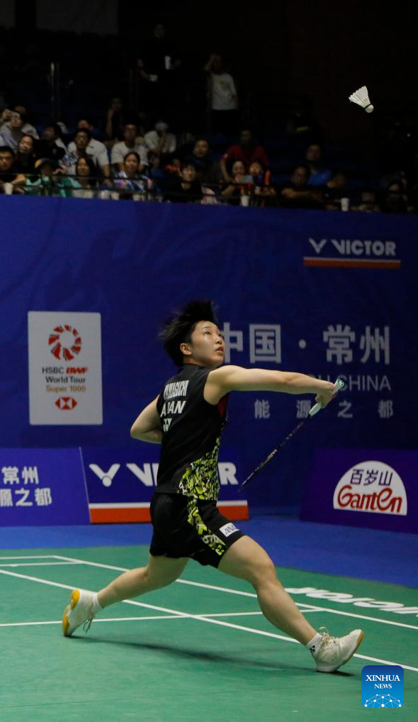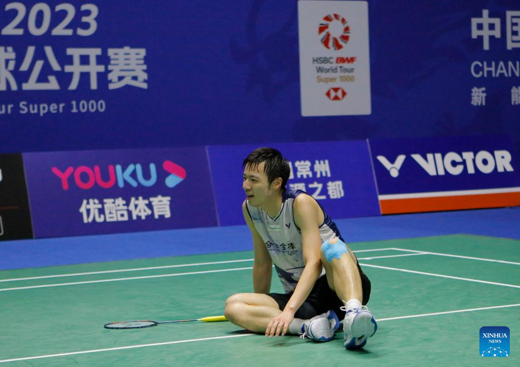 Wang Tzu Wei of Chinese Taipei reacts during the men's singles second round match between Viktor Axelsen of Denmark and Wang Tzu Wei of Chinese Taipei at the 2023 China Open badminton tournament in Changzhou, east China's Jiangsu Province, Sept. 7, 2023. (Xinhua/Liu Wenhui)