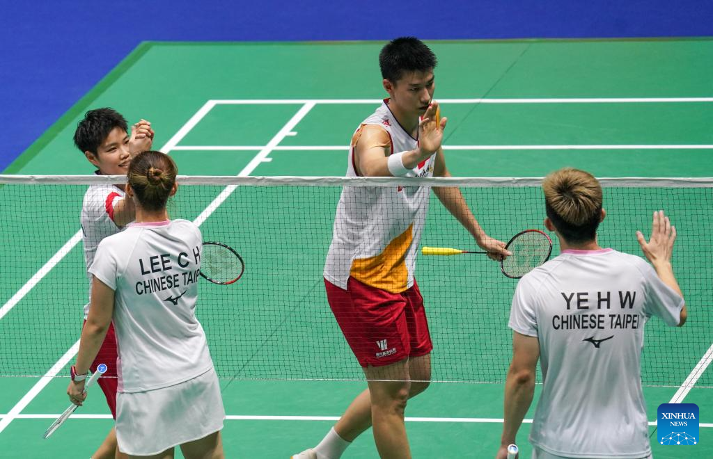 Feng Yanzhe (2nd R)/Huang Dongping (1st L) of China greet Ye Hong Wei (1st R)/Lee Chia Hsin of Chinese Taipei after their mixed doubles second round match at the 2023 China Open badminton tournament in Changzhou, east China's Jiangsu Province, Sept. 7, 2023. (Xinhua/Yang Lei)