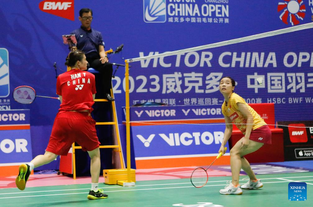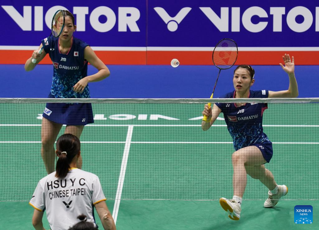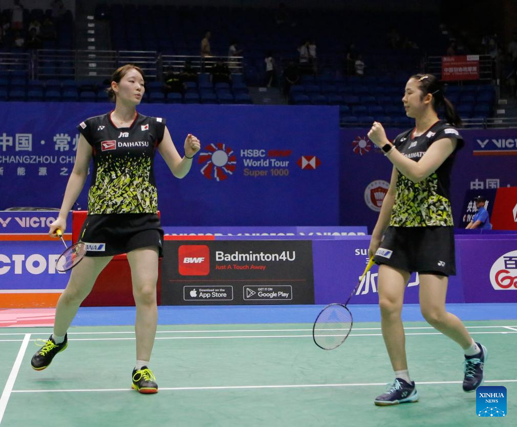 Matsuyama Nami/Shida Chiharu (top) of Japan compete during the women's doubles second round match against Hsu Ya Ching/Lin Wan Ching of Chinese Taipei at the 2023 China Open badminton tournament in Changzhou, east China's Jiangsu Province, Sept. 7, 2023. (Xinhua/Yang Lei)
