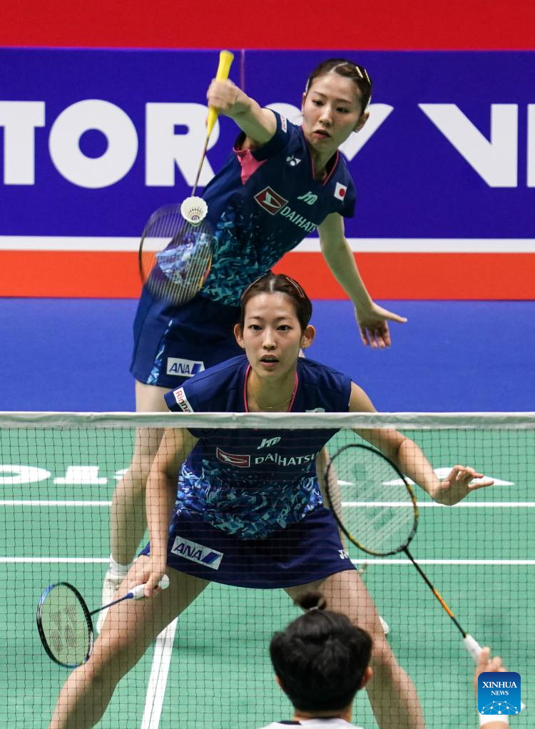 Matsumoto Mayu (L)/Nagahara Wakana of Japan compete during the women's doubles second round match between Maiken Fruergaard/Sara Thygesen of Denmark and Matsumoto Mayu/Nagahara Wakana of Japan at the 2023 China Open badminton tournament in Changzhou, east China's Jiangsu Province, Sept. 7, 2023. (Xinhua/Liu Wenhui)