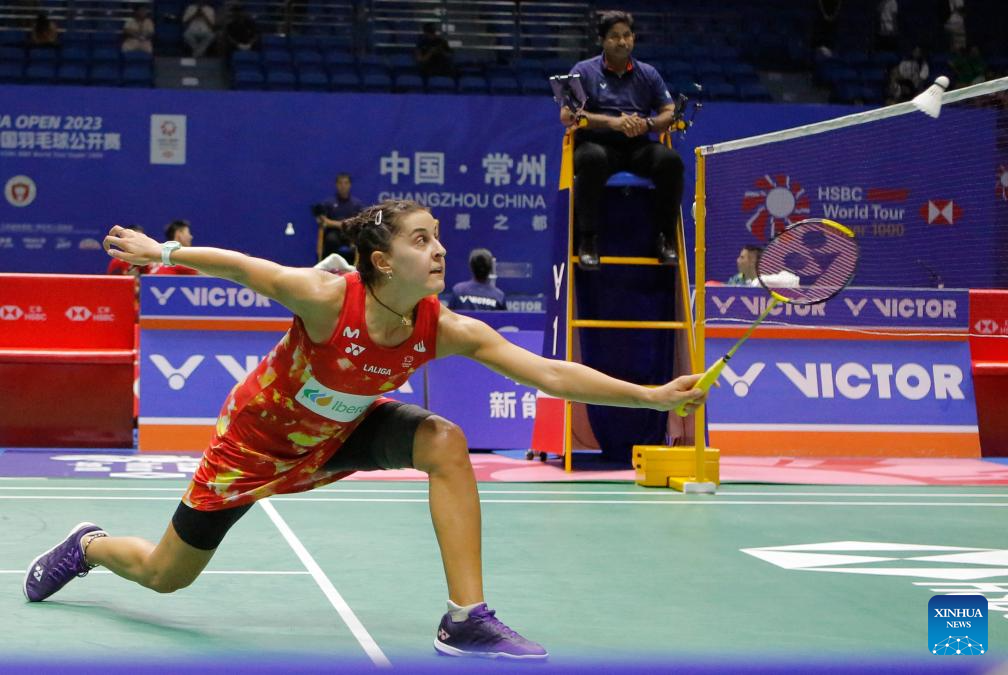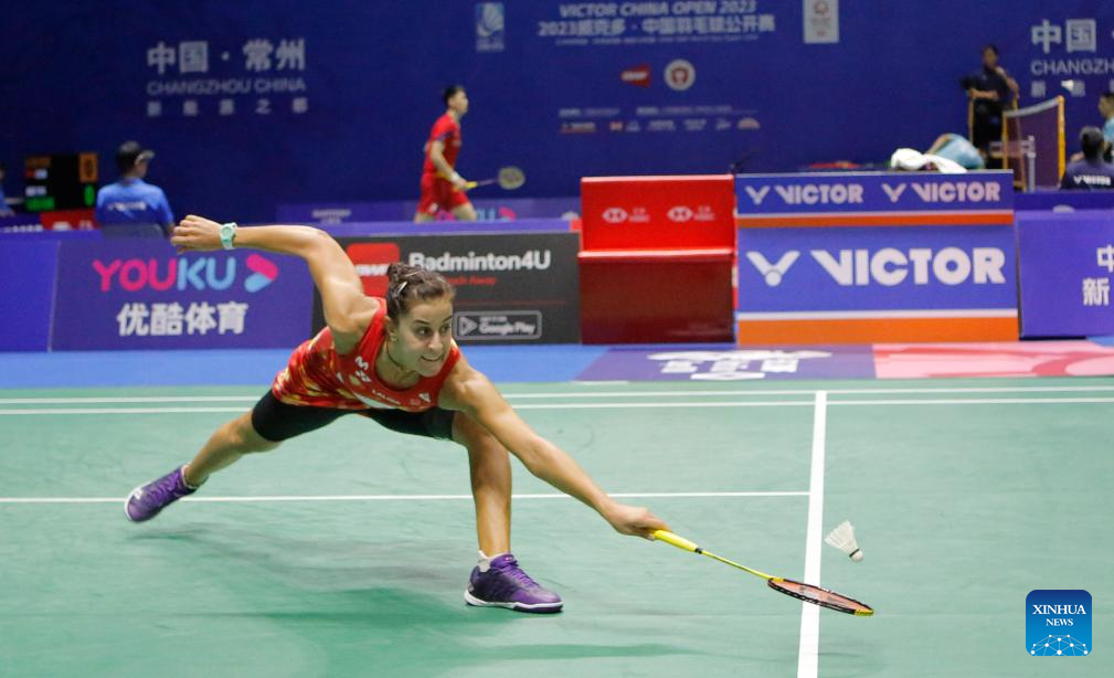 Caroline Marin of Spain hits a return during the women's singles second round match against Gao Fangjie of China at the 2023 China Open badminton tournament in Changzhou, east China's Jiangsu Province, Sept. 7, 2023. (Xinhua/Liu Wenhui)