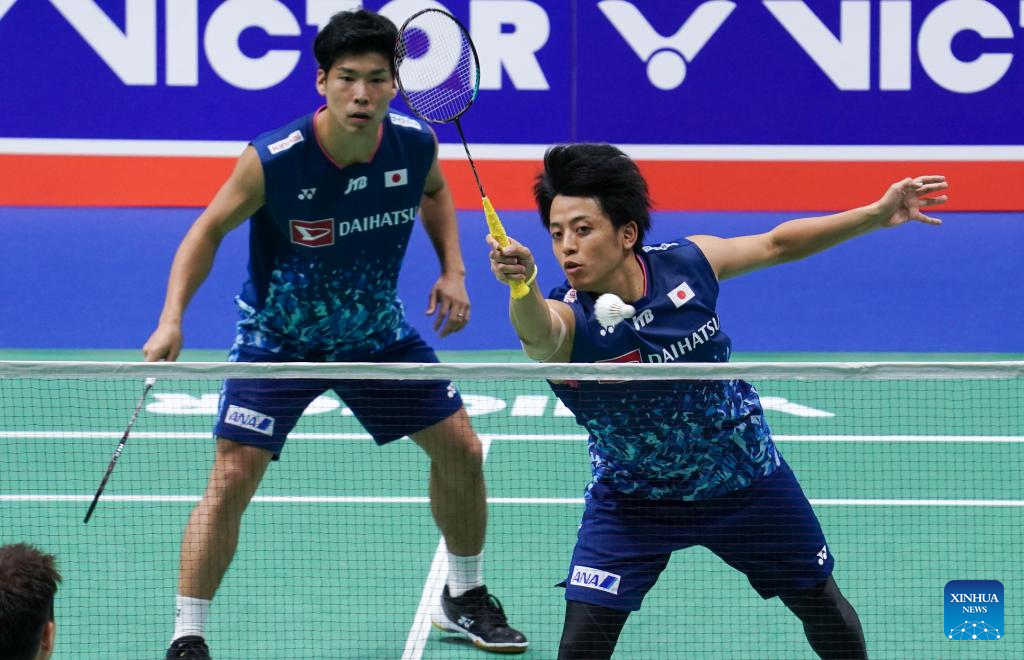 Hoki Takuro (L)/Kobayashi Yugo compete during the men's doubles second round match between Hoki Takuro/Kobayashi Yugo of Japan and Matsui Keiichiro/Takeuchi Yoshinori of Japan at the 2023 China Open badminton tournament in Changzhou, east China's Jiangsu Province, Sept. 7, 2023. (Xinhua/Liu Wenhui)