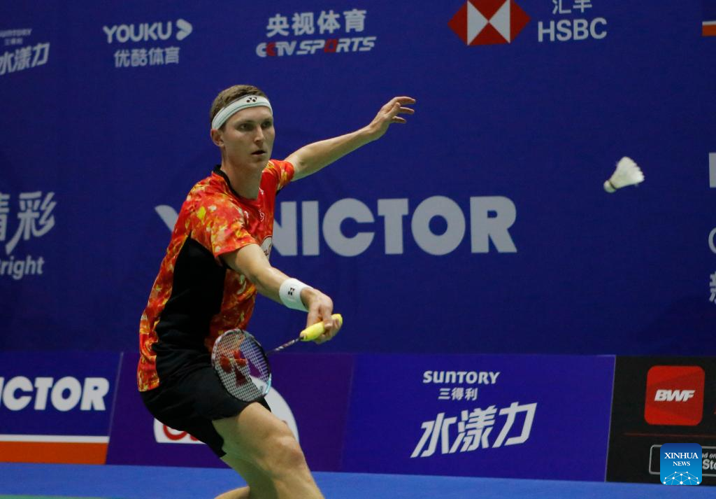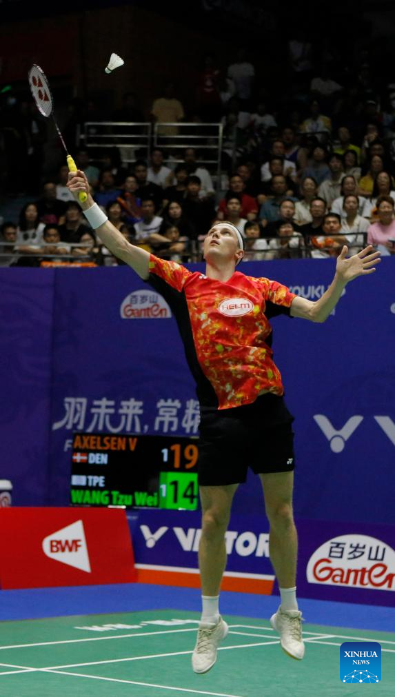 Viktor Axelsen of Denmark hits a return during the men's singles second round match between Viktor Axelsen of Denmark and Wang Tzu Wei of Chinese Taipei at the 2023 China Open badminton tournament in Changzhou, east China's Jiangsu Province, Sept. 7, 2023. (Xinhua/Liu Wenhui)