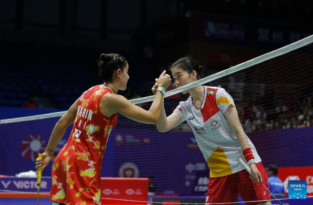 Caroline Marin (L) of Spain greets Gao Fangjie of China after their women's singles second round match at the 2023 China Open badminton tournament in Changzhou, east China's Jiangsu Province, Sept. 7, 2023. (Xinhua/Liu Wenhui)