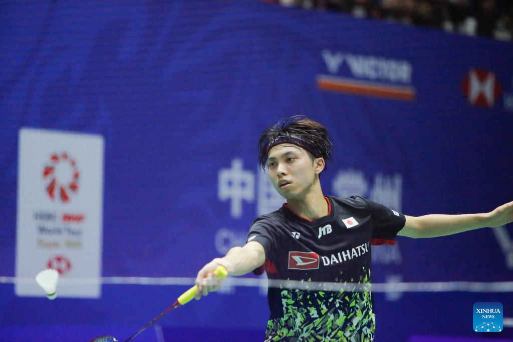 Naraoka Kodai of Japan hits a return during the men's singles second round match against Lin Chun-Yi of Chinese Taipei at the 2023 China Open badminton tournament in Changzhou, east China's Jiangsu Province, Sept. 7, 2023. (Xinhua/Liu Wenhui)