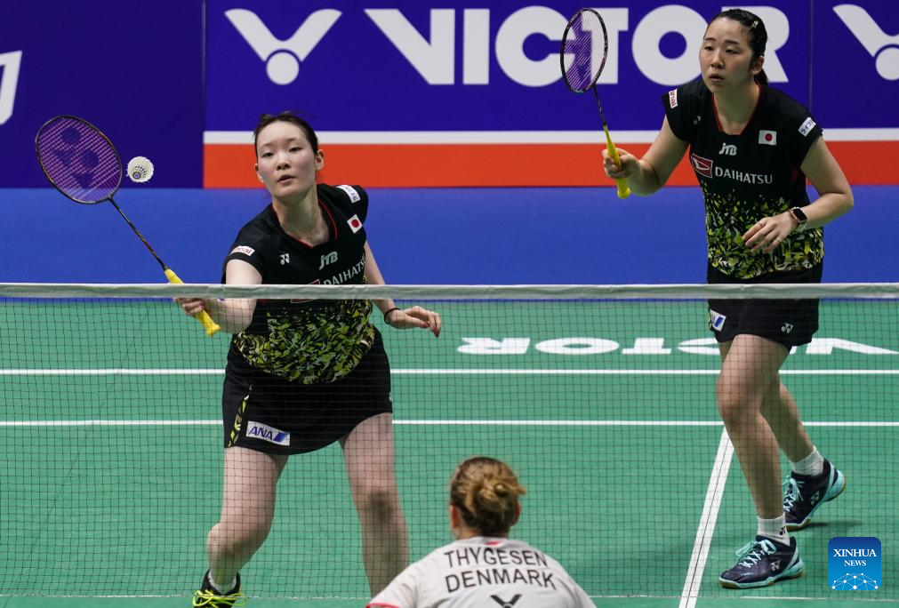 Matsumoto Mayu (L)/Nagahara Wakana of Japan compete during the women's doubles second round match against Maiken Fruergaard/Sara Thygesen of Denmark at the 2023 China Open badminton tournament in Changzhou, east China's Jiangsu Province, Sept. 7, 2023. (Xinhua/Yang Lei)