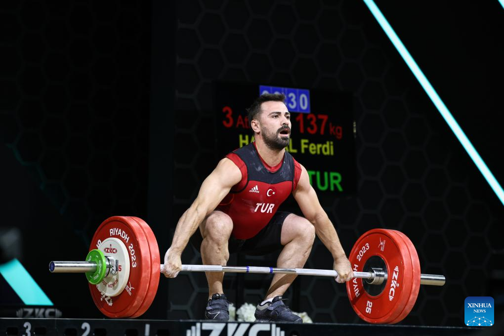 Ferdi Hardal of Türkiye competes during the men's 67 kg event at the 2023 World Weightlifting Championships in Riyadh, Saudi Arabia, Sept. 7, 2023. (Photo by Zeng Chen/Xinhua)