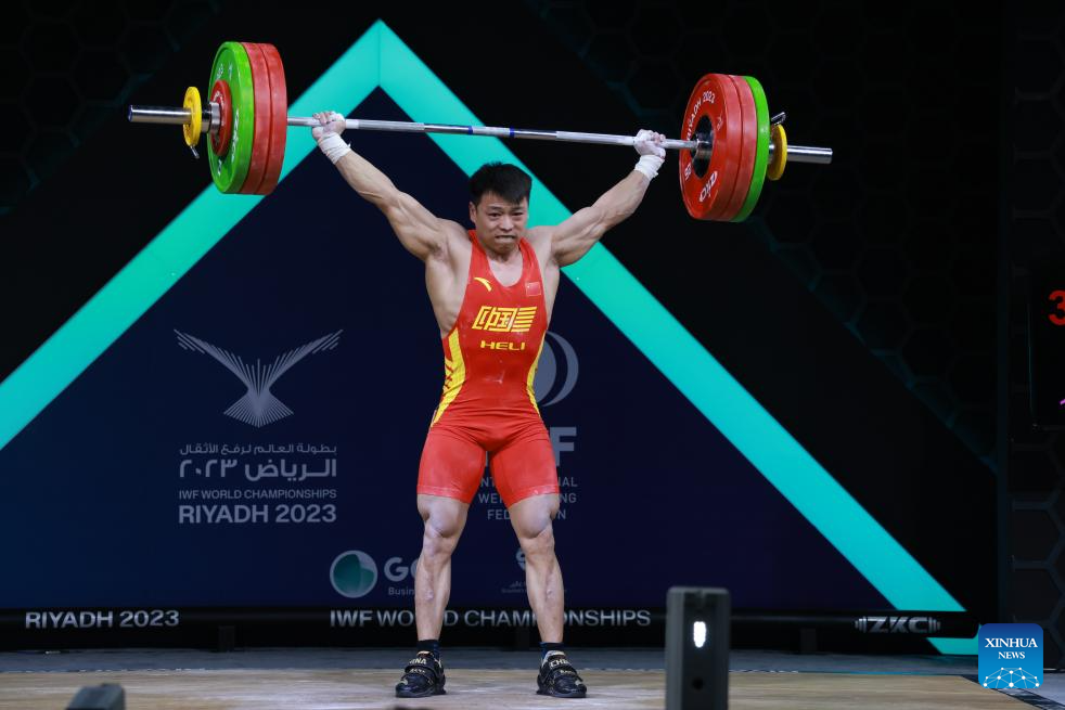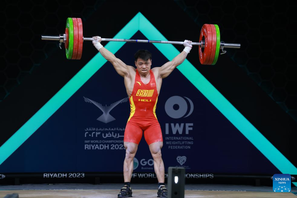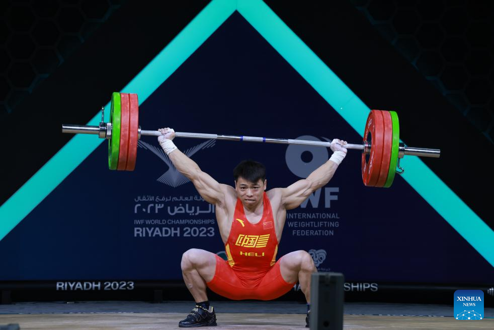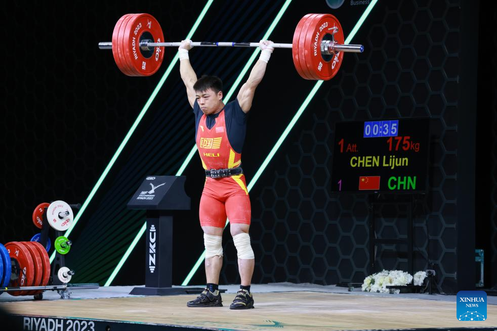 Chen Lijun of China competes during the men's 67 kg event at the 2023 World Weightlifting Championships in Riyadh, Saudi Arabia, Sept. 7, 2023. (Xinhua/Wang Haizhou)