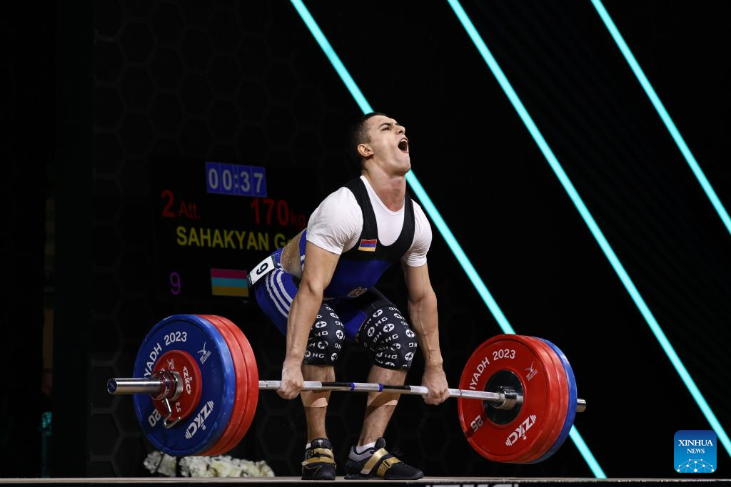 Gor Sahakyan of Armenia competes during the men's 67 kg event at the 2023 World Weightlifting Championships in Riyadh, Saudi Arabia, Sept. 7, 2023. (Photo by Zeng Chen/Xinhua)