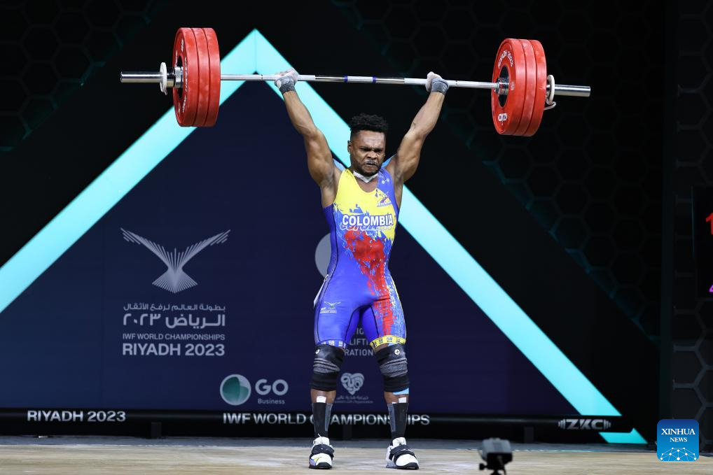 Francisco Antonio Mosquera Valencia of Colombia competes during the men's 67 kg event at the 2023 World Weightlifting Championships in Riyadh, Saudi Arabia, Sept. 7, 2023. (Photo by Zeng Chen/Xinhua)