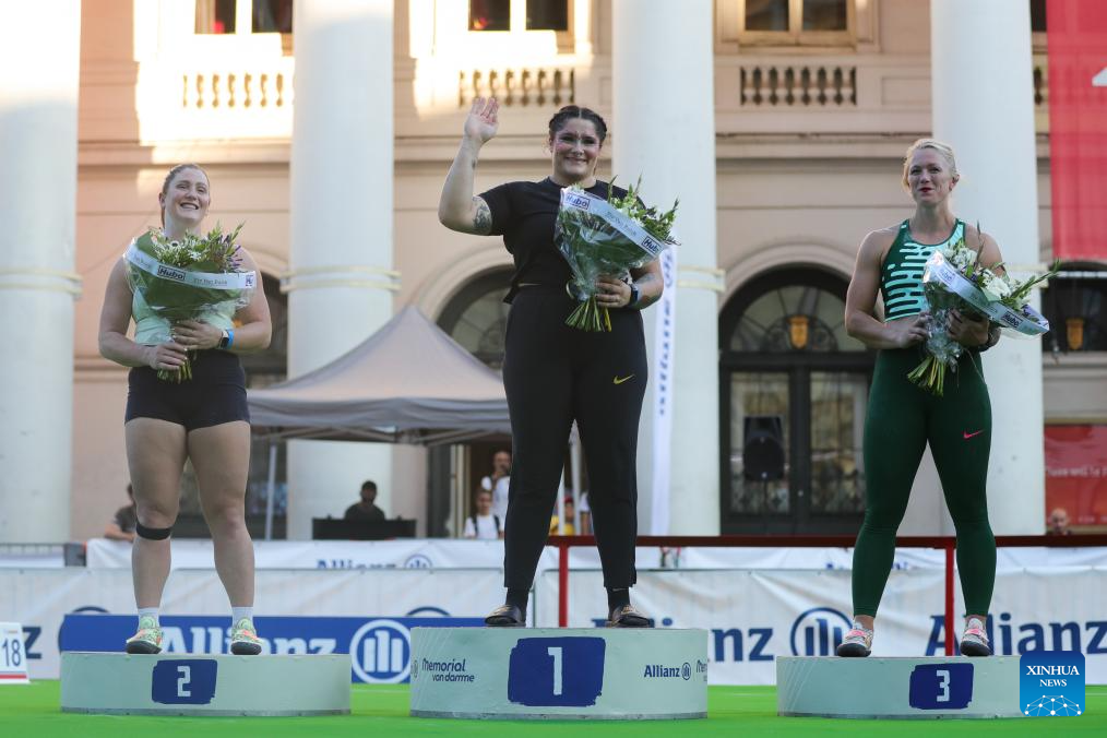 Chase Ealey of the United States (C), Sarah Mitton of Canada (L) and Maggie Ewen of the United States pose for photos at the award ceremony after the Women's Shot Put final at the 2023 Diamond League meeting in Brussels, Belgium, Sept. 7, 2023. (Xinhua/Zheng Huansong)