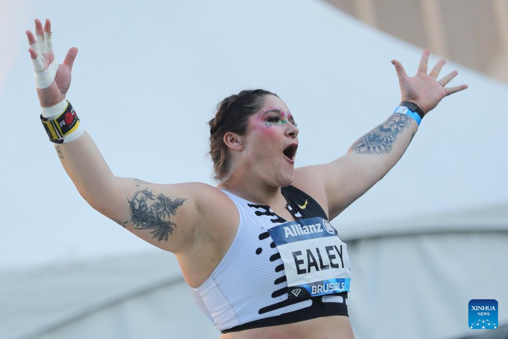 Chase Ealey of the United States celebrates during the Women's Shot Put final at the 2023 Diamond League meeting in Brussels, Belgium, Sept. 7, 2023. (Xinhua/Zheng Huansong)
