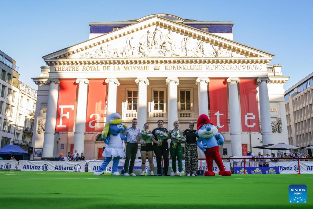 Chase Ealey of the United States (C), Sarah Mitton of Canada (3rd L) and Maggie Ewen of the United States (3rd R) pose for photos at the award ceremony after the Women's Shot Put final at the 2023 Diamond League meeting in Brussels, Belgium, Sept. 7, 2023. (Xinhua/Zheng Huansong)
