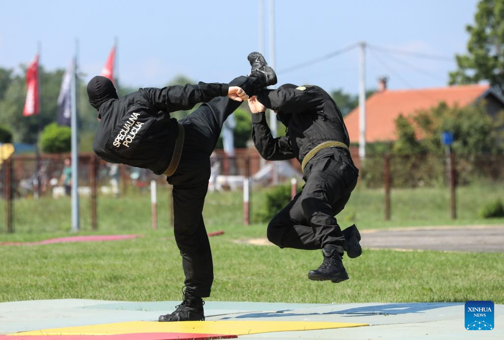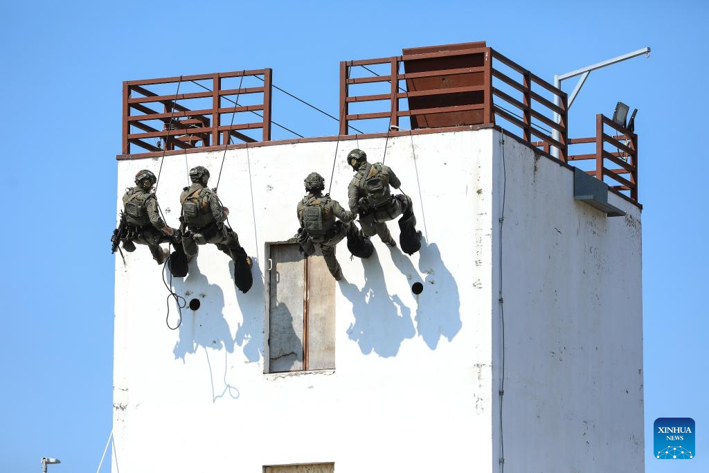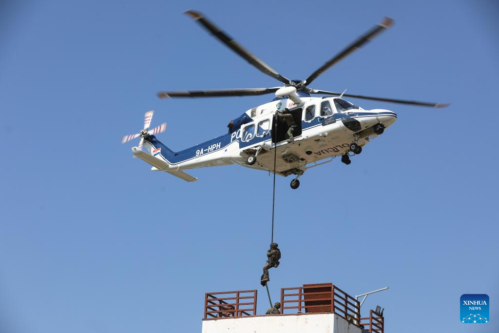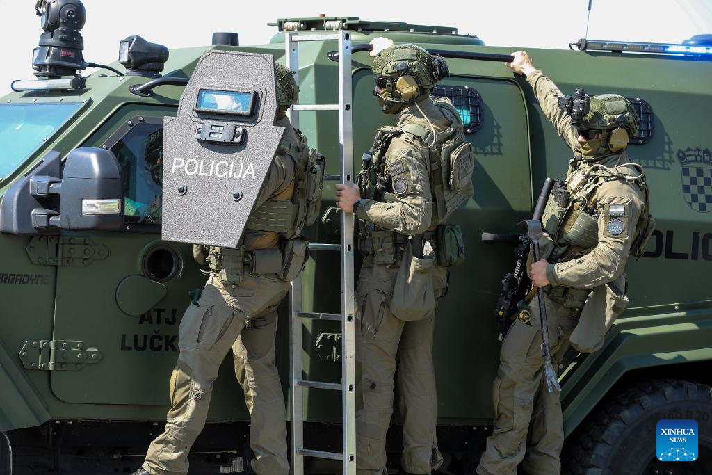 Members of the Lucko Anti-terrorist Unit take part in a demonstration exercise in Zagreb, Croatia, on Sept. 7, 2023. The 33rd anniversary of the founding of the Croatian special police Lucko anti-terrorist unit was celebrated here on Thursday. (Robert Anic/PIXSELL via Xinhua)