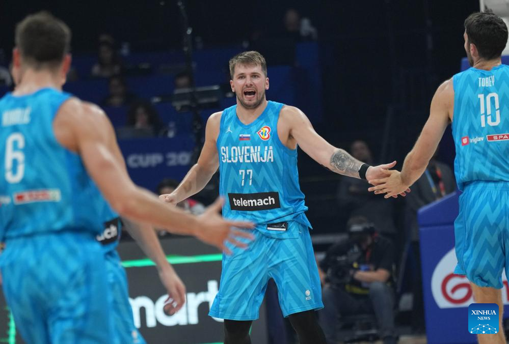 Slovenia's Luka Doncic (C) greets teammates during the Classification Games 7-8 between Italy and Slovenia at the 2023 FIBA World Cup in Manila, the Philippines, Sept. 9, 2023. (Xinhua/Meng Yongmin)