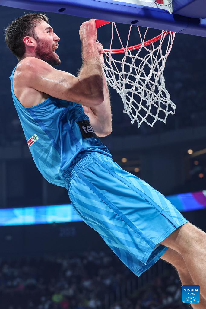 Slovenia's Mike Tobey reacts during the Classification Games 7-8 between Italy and Slovenia at the 2023 FIBA World Cup in Manila, the Philippines, Sept. 9, 2023. (Xinhua/Wu Zhuang)