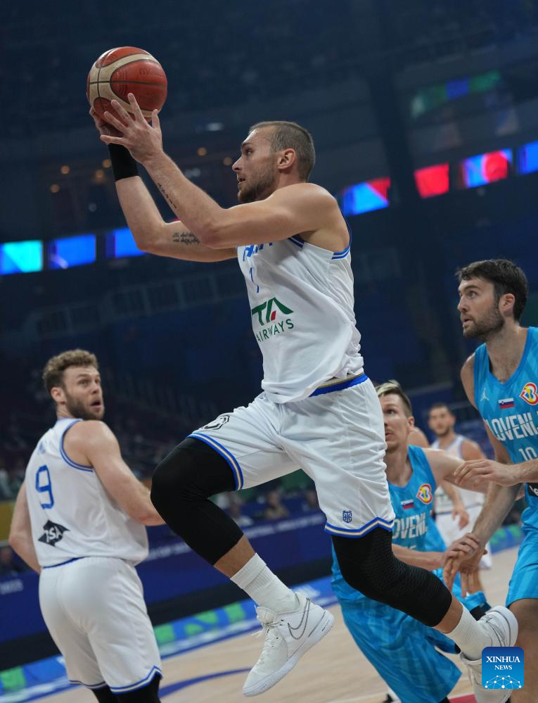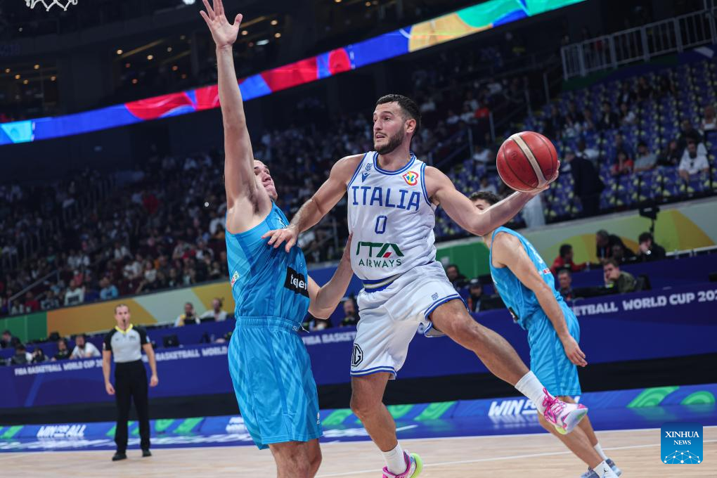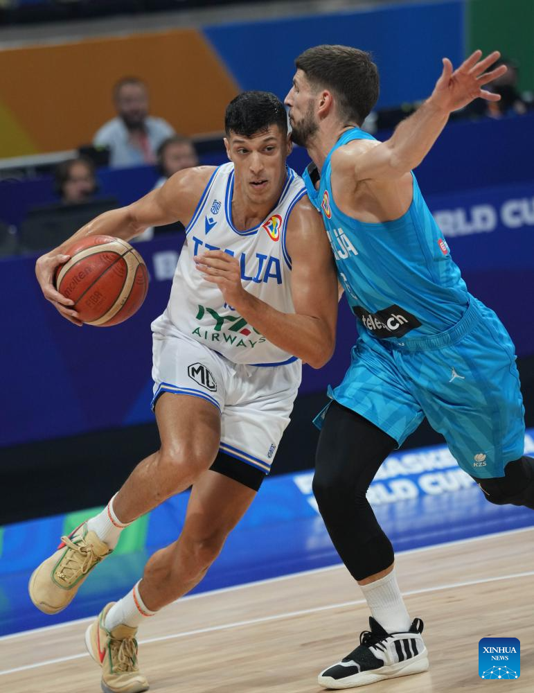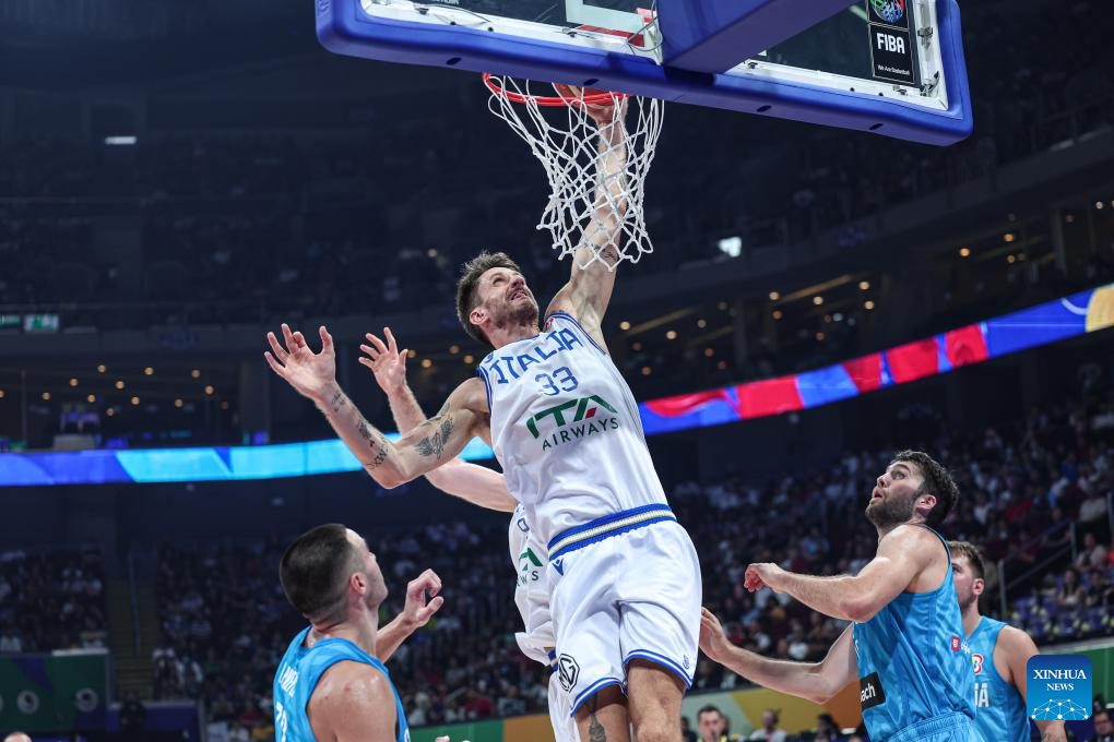 Italy's Stefano Tonut (front) competes during the Classification Games 7-8 between Italy and Slovenia at the 2023 FIBA World Cup in Manila, the Philippines, Sept. 9, 2023. (Xinhua/Meng Yongmin)