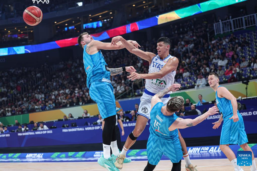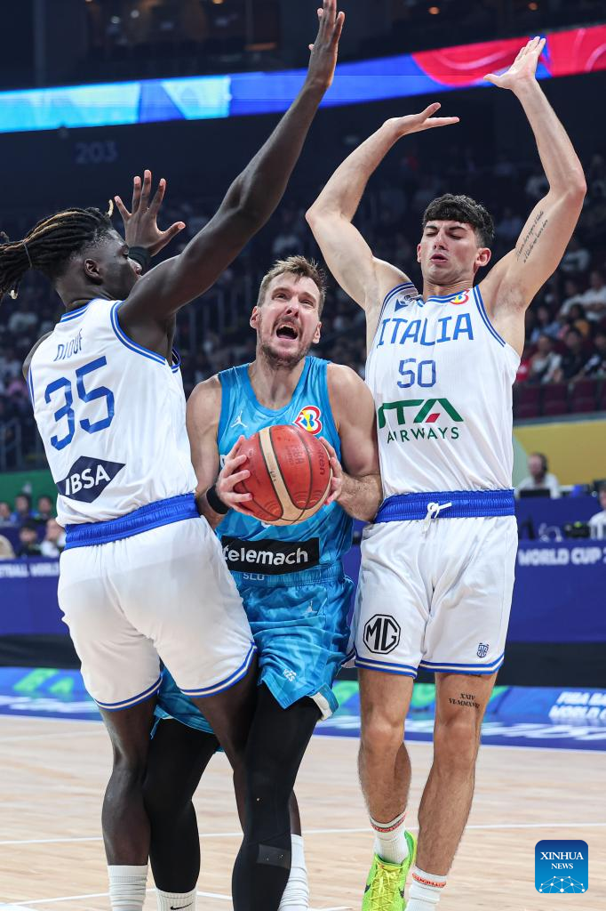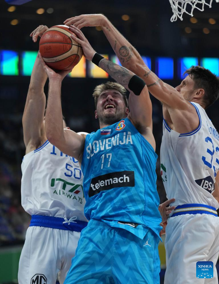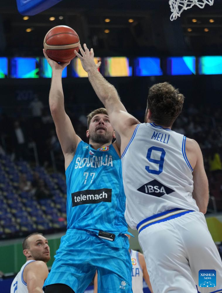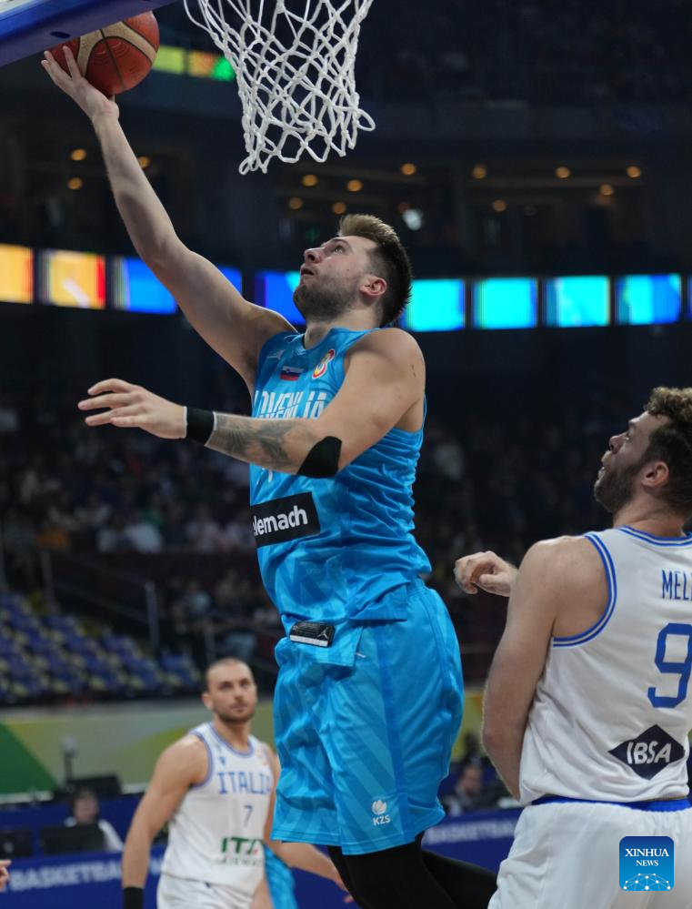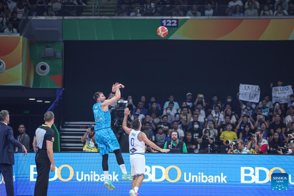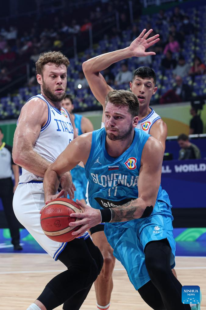 Slovenia's Luka Doncic (2nd R) shoots during the Classification Games 7-8 between Italy and Slovenia at the 2023 FIBA World Cup in Manila, the Philippines, Sept. 9, 2023. (Xinhua/Wu Zhuang)