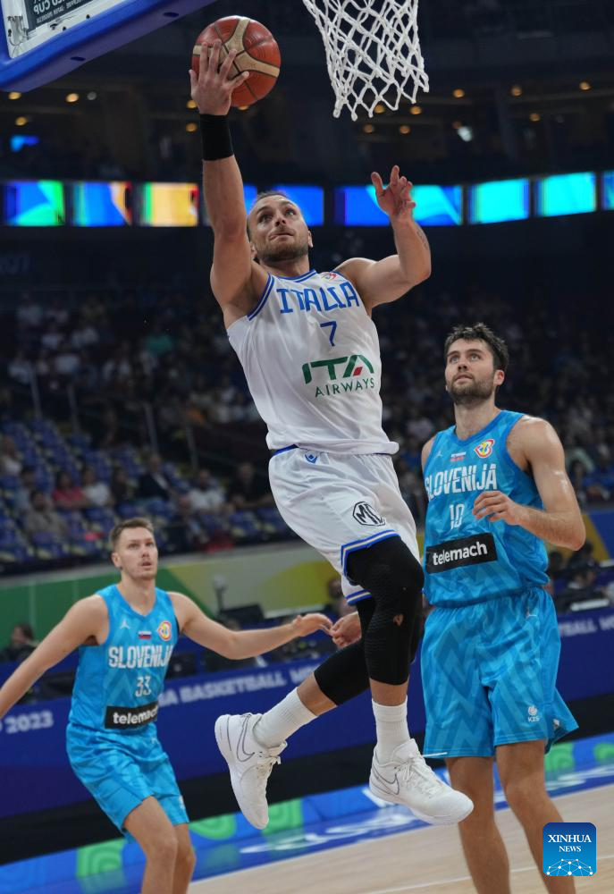 Italy's Stefano Tonut (C) goes for a lay up during the Classification Games 7-8 between Italy and Slovenia at the 2023 FIBA World Cup in Manila, the Philippines, Sept. 9, 2023. (Xinhua/Meng Yongmin)