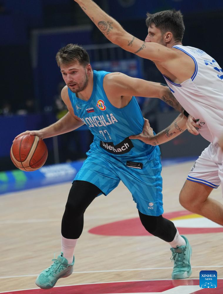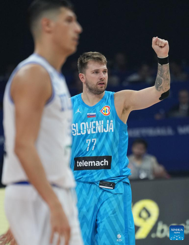 Slovenia's Luka Doncic (front) competes during the Classification Games 7-8 between Italy and Slovenia at the 2023 FIBA World Cup in Manila, the Philippines, Sept. 9, 2023. (Xinhua/Wu Zhuang)