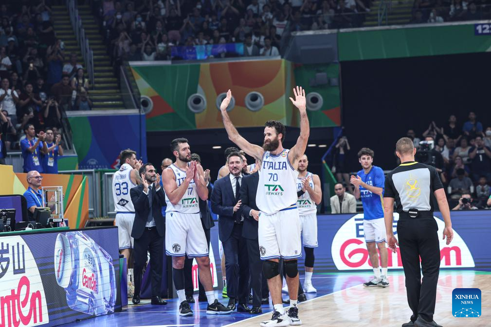 Italy's Luigi Datome (4th R) greets spectators after the Classification Games 7-8 between Italy and Slovenia at the 2023 FIBA World Cup in Manila, the Philippines, Sept. 9, 2023. (Xinhua/Wu Zhuang)