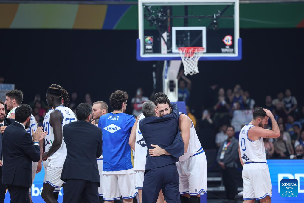 Italy's Luigi Datome (2nd R) hugs his coach Gianmarco Pozzecco (3rd R) after the Classification Games 7-8 between Italy and Slovenia at the 2023 FIBA World Cup in Manila, the Philippines, Sept. 9, 2023. (Xinhua/Wu Zhuang)