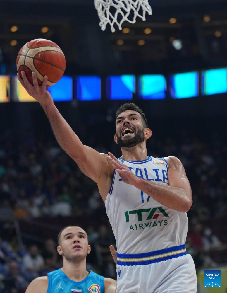 Italy's Simone Fontecchio (R) shoots during the Classification Games 7-8 between Italy and Slovenia at the 2023 FIBA World Cup in Manila, the Philippines, Sept. 9, 2023. (Xinhua/Meng Yongmin)