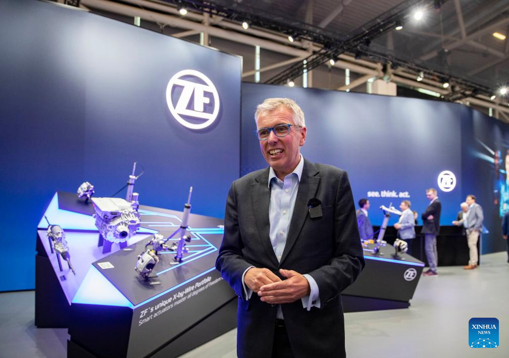 ZF Group CEO Holger Klein gives an interview with Xinhua on the sidelines of the IAA Mobility 2023 auto show in Munich, Germany, Sept. 4, 2023. (Xinhua/Zhang Fan)