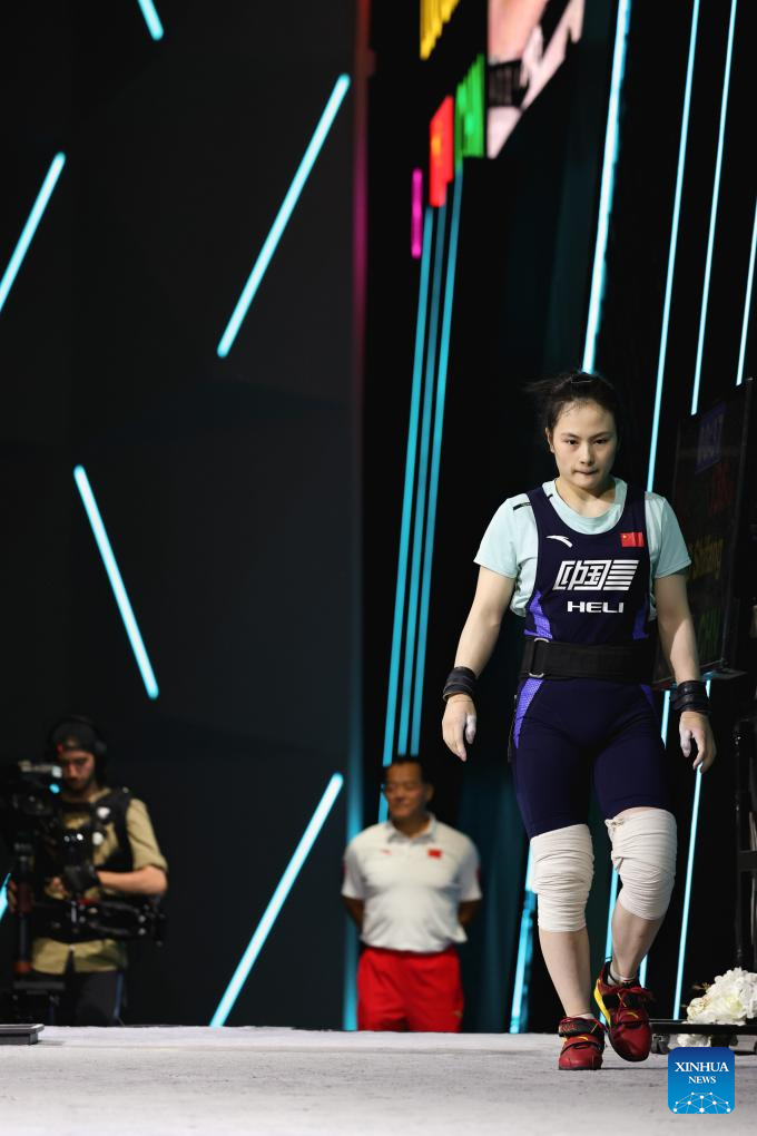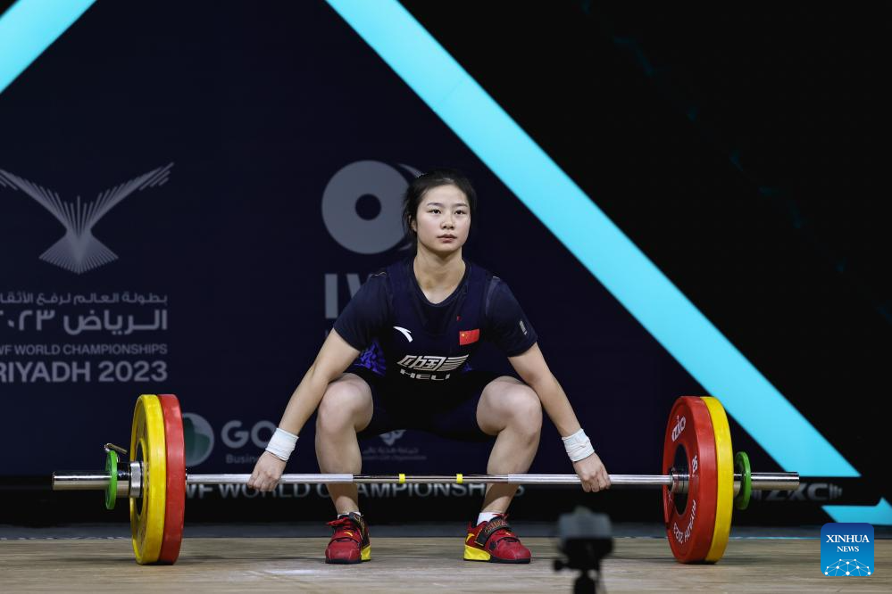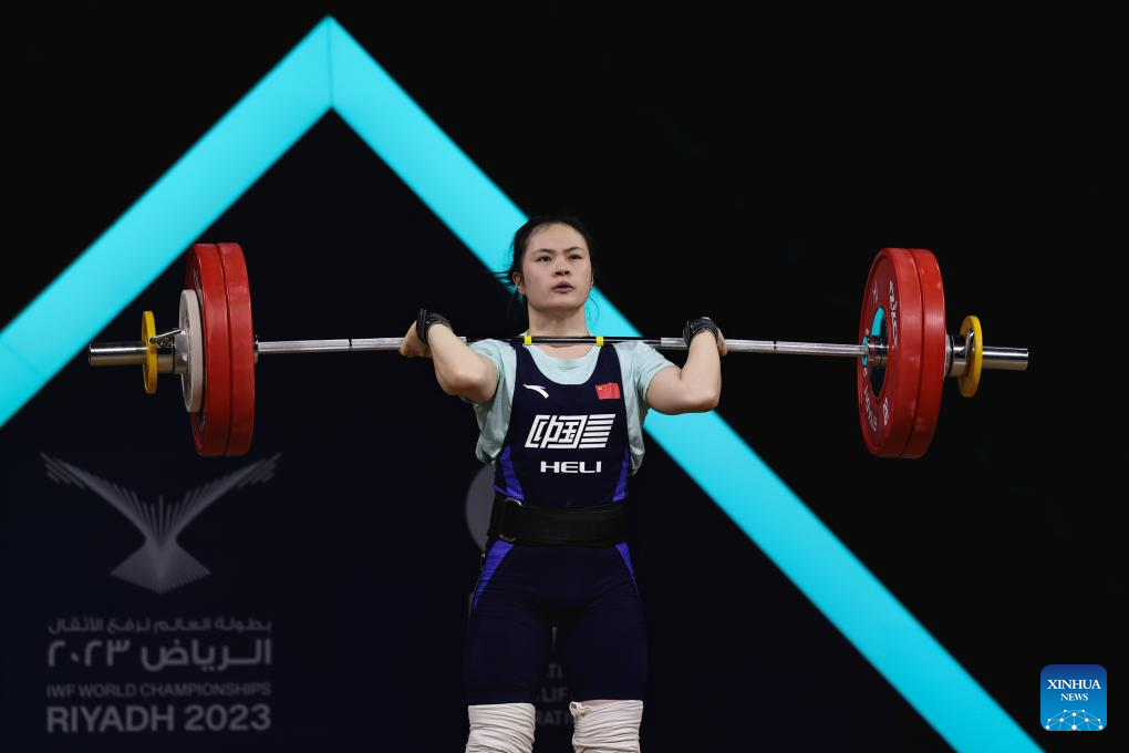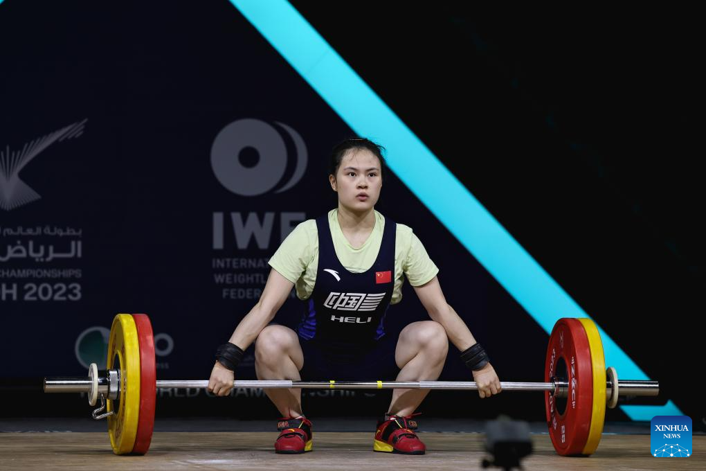 Luo Shifang of China competes during the women's 59 kg event at the 2023 World Weightlifting Championships in Riyadh, Saudi Arabia, Sept. 8, 2023. (Photo by Zeng Chen/Xinhua)