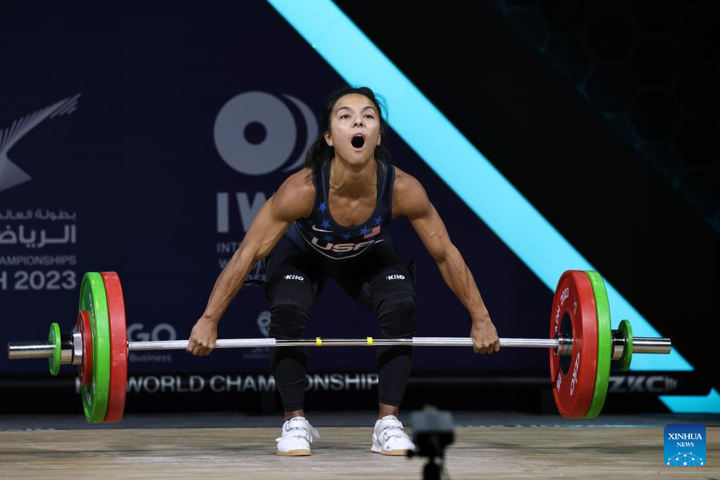 Taylor Nicole Wilkins of the United States competes during the women's 59 kg event at the 2023 World Weightlifting Championships in Riyadh, Saudi Arabia, Sept. 8, 2023. (Photo by Zeng Chen/Xinhua)