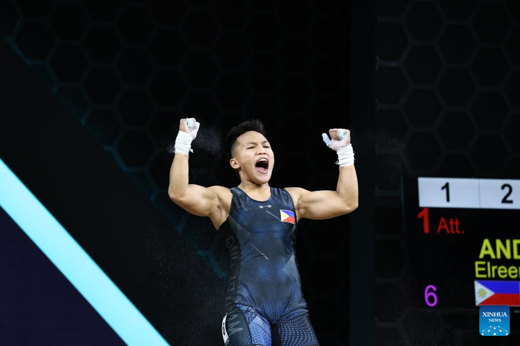 Elreen Ann Ando of the Philippines celebrates during the women's 59 kg event at the 2023 World Weightlifting Championships in Riyadh, Saudi Arabia, Sept. 8, 2023. (Photo by Zeng Chen/Xinhua)