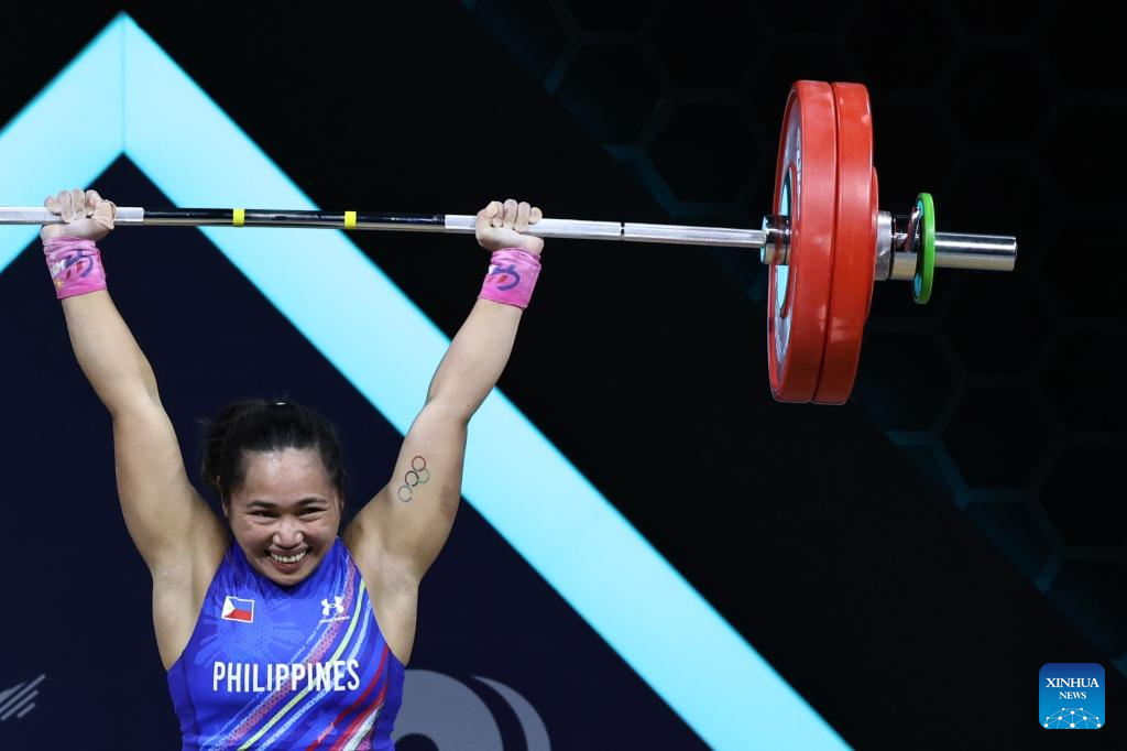 Hidilyn Diaz of the Philippines competes during the women's 59 kg event at the 2023 World Weightlifting Championships in Riyadh, Saudi Arabia, Sept. 8, 2023. (Photo by Zeng Chen/Xinhua)