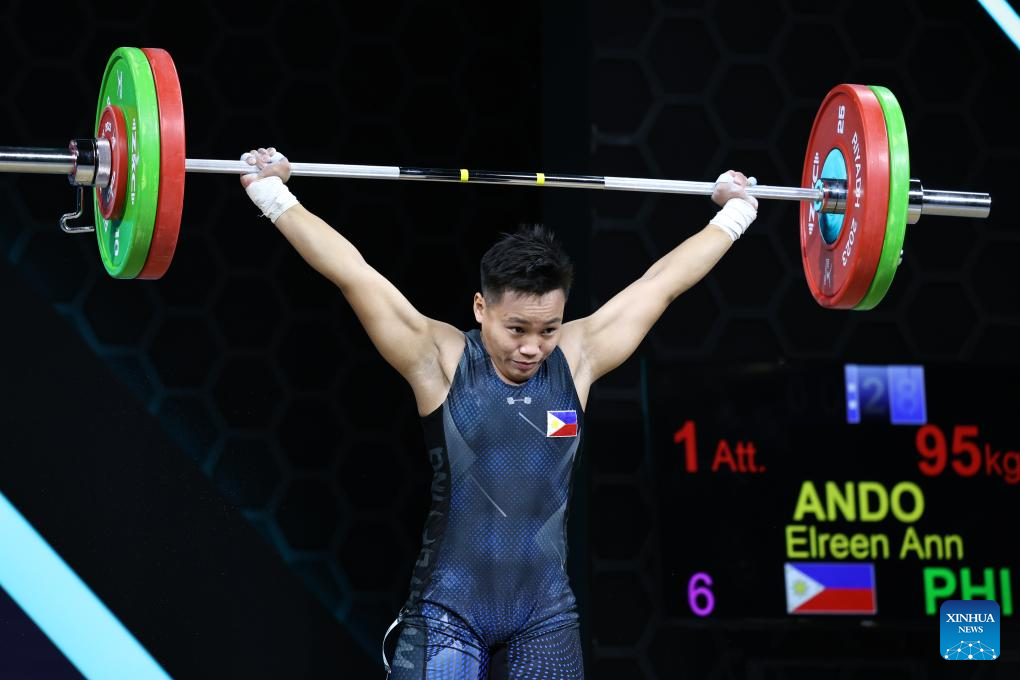 Elreen Ann Ando of the Philippines competes during the women's 59 kg event at the 2023 World Weightlifting Championships in Riyadh, Saudi Arabia, Sept. 8, 2023. (Photo by Zeng Chen/Xinhua)