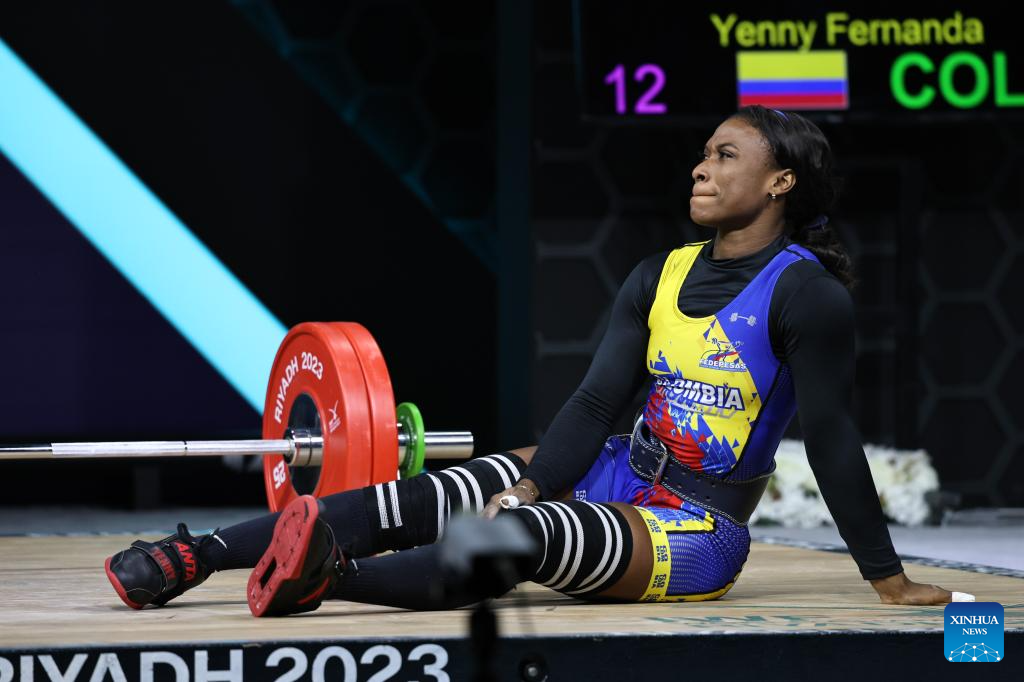 Colombia's Yenny Fernanda Alvarez Caicedo reacts during the women's 59 kg event at the 2023 World Weightlifting Championships in Riyadh, Saudi Arabia, Sept. 8, 2023. (Photo by Zeng Chen/Xinhua)